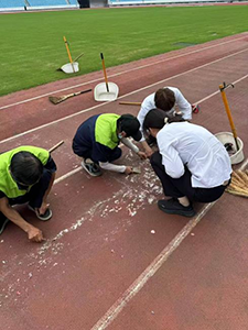 周經(jīng)理和保潔團(tuán)隊(duì)一到體育場就立即展開了清理行動。她們首先用鏟刀將跑道上較大的紙片鏟下來,這一過程雖然簡單,但卻需要細(xì)心與耐心,以確保跑道表面不受損害。大的紙片被迅速清理后,接下來的工作就更為細(xì)致了。