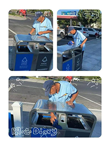 每天清晨,淹城服務區(qū)保潔大叔都會推著小車來到服務區(qū)廣場。他總是熟練的從車上取下抹布和水桶。雖然不銹鋼垃圾桶在陽光下閃閃發(fā)亮,但走近看就會發(fā)現(xiàn)上面沾著不少污漬和手指印。