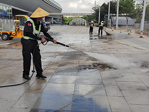 在風(fēng)雨連廊施工圍擋拆除后,廣場上遺留了不少建筑垃圾、灰塵和雜物。面對這一情況,保安員和保潔員們沒有絲毫懈怠。保潔員們手持掃帚、簸箕等工具,分工明確,對廣場地面的塵土、碎石等進行細致清掃。他們不放過任何一個角落,哪怕是藏在縫隙里的微小垃圾,也一一清理出來。同時,部分保安員還使用高壓水槍,對地面上頑固的污漬進行沖洗。經(jīng)過水流的強力沖刷,原本沾滿污漬的地面逐漸恢復(fù)潔凈