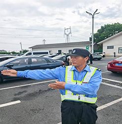 “師傅,這邊停車位空著,小心慢行!”小黃山服務(wù)區(qū)內(nèi)車流如織,保安鄭龍品身著反光制服,一邊引導(dǎo)車輛有序停放,一邊耐心解答司乘疑問,額角的汗珠順著臉頰滑落,卻絲毫未影響他專注的神情。