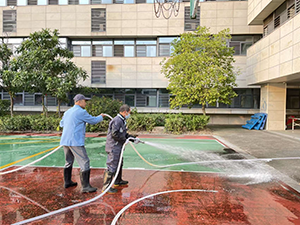 此次需要清洗的籃球場(chǎng)長(zhǎng)期暴露在戶外,狀況不容樂觀。塑膠地面部分開裂起皮,臟污淤積其中,地勢(shì)不平的地方由于常年少陽光照射,經(jīng)雨水沖刷后臟污大量堆積,地面十分滑膩。為了盡快完成清洗工作,項(xiàng)目部緊急調(diào)集工作人員,大家分工明確,采用地刷和水管沖洗的方式,對(duì)場(chǎng)地進(jìn)行全面細(xì)致的清洗。工作人員們不怕臟、不怕累,不放過任何一個(gè)角落。在完成清洗后,又及時(shí)將地面積水拖干凈,確保場(chǎng)地干燥、安全。